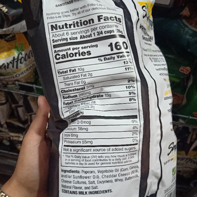 Smartfood - Popcorn- White Cheddar - Save-On-Foods Popcorn, Vegetable Oil, Seasoning (Cheddar Cheese (Milk, Cheese Cultures, Salt, Enzymes), Whey, Buttermilk, Natural Flavour, Salt). Contains Milk Ingredients. Nutrition Facts Serving Size 50 GR Calories 280 % Daily Value* Fat 18g 27 % Saturated Fat 3.5g 19 % + Trans 0.1g Carbohydrate 25g Fibre 4g 15 % Sugars 3g Protein 6g Cholesterol 10mg