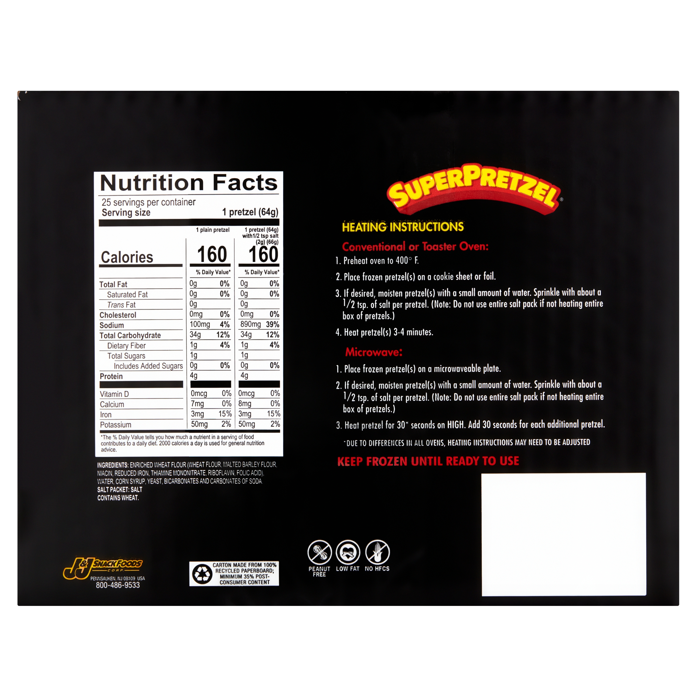 J & J Snack Foods SuperPretzel 5 oz. King Size Baked Soft Pretzel - 50/Case It is perfect for serving plain, salted, or topped with your signature dips, cheeses, and mustards. Plus, this pretzel has zero cholesterol and is low in fat and sugar, making it a great option for your health-conscious consumers.
