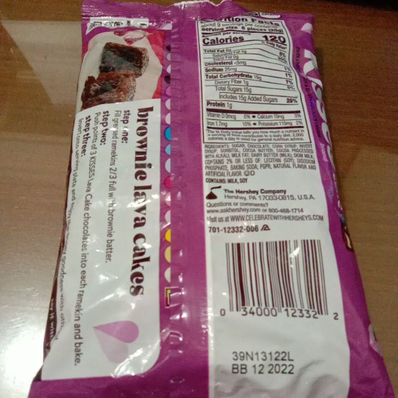 HERSHEY'S KISSES - Milk Chocolates Filled with Cherry Cordial Crème ... HERSHEY'S KISSES - Milk Chocolates Filled with Cherry Cordial Crème - SmartLabel™ 180 Calories 5 Sat Fat (g) 30 Sodium (mg) 25 Sugars (g) Nutrition Facts about 7 servings per container Serving Size 9 pieces (42g) Amount per serving Calories 180 % Daily Value* Total Fat 8g 12% Saturated Fat 5g 25% Trans Fat 0g Cholesterol 10mg 3% Sodium 30mg 1% HERSHEY'S KISSES Milk Chocolate Candy, 17.9 oz pack Nutrition Information Nutrition Facts Servings Per Container about 16 Serving size 7 pieces Amount per serving Calories 160 % Daily Value* Total Fat 9g 12% Saturated Fat 6g 29% Trans Fat 0g Cholesterol 10mg 3% Sodium 25mg 1% Total Carbohydrates 19g 7% Dietary Fiber <1g 3% Total Sugars 18g Includes 16g Added Sugar 31% Protein 2g Hershey's Nutrition Facts. Calories, carbs, fat, sodium & more ... Get nutrition information for Hershey's items and over 200,000 other foods (including over 3,500 brands). Track calories, carbs, fat, sodium, sugar & 14 other nutrients. ... Hershey's Deluxe Kisses w/ Hazelnut Centers. 4 pieces (34g) Nutrition Facts. 170 calories. Log food: Hershey's Unsweetened Chocolate Baking Bar. 1 block (14g) Are Hershey's Kisses Gluten-Free? - The GFB GLUTEN FREE CONFIDENCE SCORE: 5/10. It depends on which type of Hershey Kisses. The above are the flavors of KISSES that Hershey's claim to be gluten-free on their website. This information may change and it is always a good idea to check the labels. Please read the ingredient and nutrition label carefully.