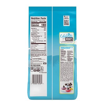 HERSHEY'S KISSES - Milk Chocolates - SmartLabel™ HERSHEY'S KISSES - Milk Chocolates - SmartLabel™ Milk Chocolates 200 Calories 7 Sat Fat (g) 35 Sodium (mg) 23 Sugars (g) Nutrition Facts 1 servings per container Serving Size 1 package (41g) Amount per serving Calories 200 % Daily Value* Total Fat 12g 18% Saturated Fat 7g 35% Trans Fat 0g Cholesterol 10mg 3% Sodium 35mg 1% Total Carbohydrate 25g 8% HERSHEY'S KISSES Sugar Cookie White Creme Candy, 9 oz bag Nutrition Facts Servings Per Container about 9 Serving size 7 pieces (30g) Amount per serving Calories 150 % Daily Value* Total Fat 8g 10% Saturated Fat 5g 26% Trans Fat 0g Cholesterol 0mg 0% Sodium 40mg 2% Total Carbohydrates 19g 7% Dietary Fiber 0g 0% Total Sugars 15g Includes 12g Added Sugar 24% Sugar Alcohols 0g Protein 2g Vitamin D 0.4mcg 2% Hershey's Products, Calories and Nutritional Information Strawberry Ice Cream Cone Kisses Per 7 pieces - Calories: 160kcal | Fat: 8.00g | Carbs: 19.00g | Protein: 2.00g view more hershey's ice creams products