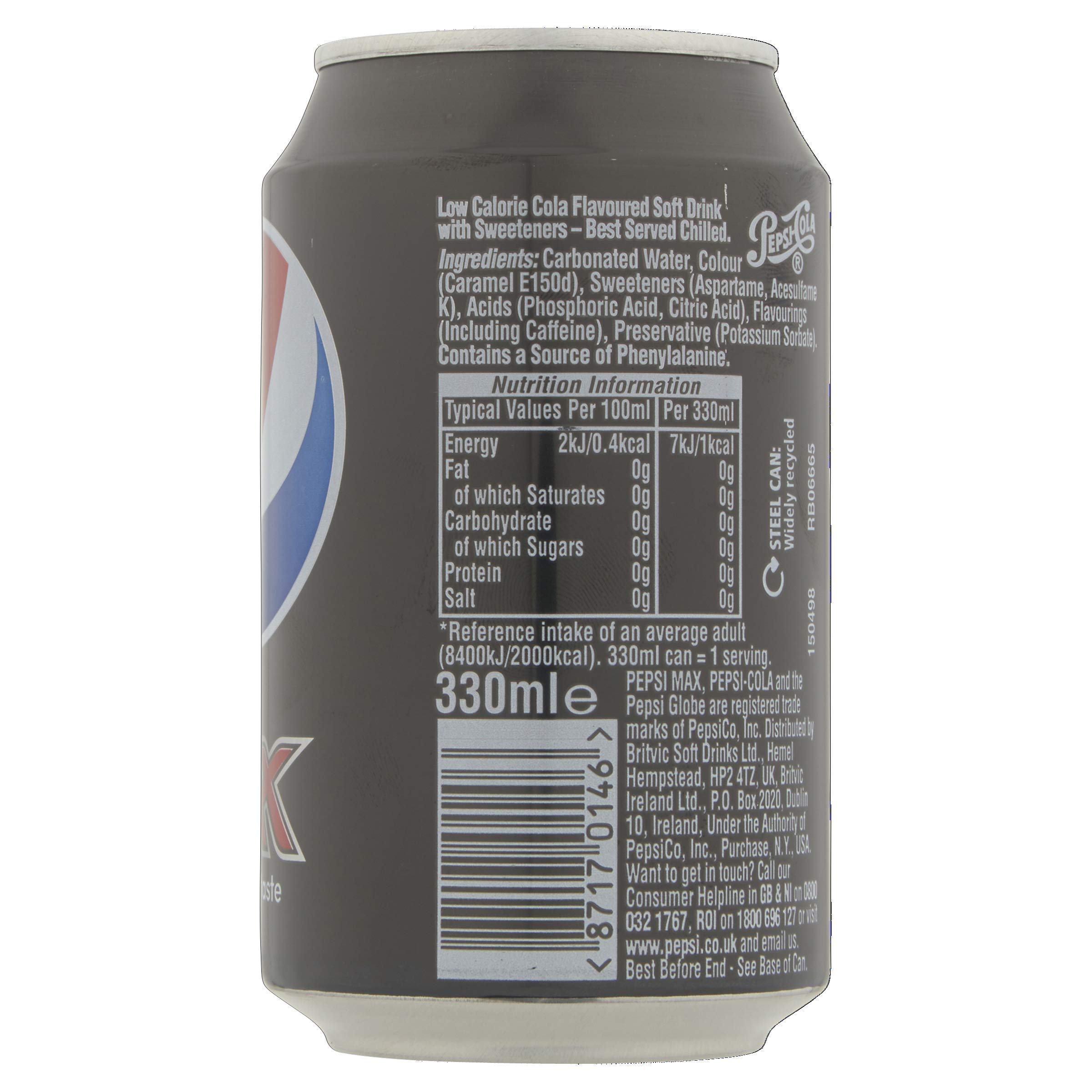 Pepsi MAX - Ingredients & Nutritional Information Pepsi MAX Maximum taste. No sugar INGREDIENTS Carbonated Water, Colour (Caramel E150d), Sweeteners (Aspartame, Acesulfame K), Acids (Phosphoric Acid, Citric Acid), Flavourings (Including Caffeine), Preservative (Potassium Sorbate). Contains a Source of Phenylalanine. SIZES Nutritional Information 330ml can = 1 serving DIET PEPSIPEPSI PEPSIPEPSI Total Carbs in Pepsi Max - Nutrition Facts for Pepsi Max In a Pepsi Max ( (1 Can Or 12 Fl Oz Serving) ) there are about 0 calories out of which 0 calories come from fat. The total fat content of (1 Can Or 12 Fl Oz Serving) Pepsi Max is 0 g. Within the fat content, a Pepsi Max contains 0 g of saturated fat, 0 g of trans fat, 0 g of polyunsaturated fat and 0 g of monounsaturated fat. Pepsi Max Nutrition Facts - Eat This Much Pepsi Max Nutrition Facts - Eat This Much Pepsi Max Zero Calories RMGSugar FreeVery Low Sodium12 FL OZ355 mL - PepsiCo, Inc. Find on Amazon Percent calories from... Quick stats 0 Calories 0g Carbs (0g net carbs) 0g Fat 0g Protein No price info Try our free Diet Generator I want to eat calories in meals. I like to eat Pepsi Max: How much Caffeine, Sugar and Calories - CheckCaffeine.com The Pepsi Max has 42.6 mg of caffeine which isn't that much, so you wouldn't feel any caffeine effects if you are a regular coffee drinker. This drink has 0 g sugar, so it is suitable for people trying weight loss exercises. It has 0 calories, making it a great drink for people on low-calorie diets. Contents show Pepsi Max Caffeine: