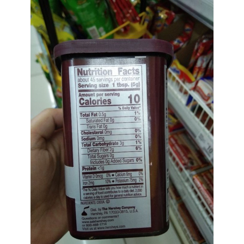 HERSHEY'S SPECIAL DARK - Dark Cocoa - SmartLabel™ HERSHEY'S SPECIAL DARK. Dark Cocoa. net wt. 8 oz. 00034000053001. Nutrition . Ingredients . Allergens . Features & Benefits. Company, Brand & Sustainability. 10. Calories. 0. Sat Fat (g) 0. Sodium (mg) 0. Sugars (g) Nutrition Facts. about 45 servings per container Serving Size. 1 tbsp (5g) Amount per serving. Calories. 10 % Daily Value* HERSHEY'S SPECIAL DARK - Dark Cocoa - SmartLabel™ Nutrition Facts about 45 servings per container Serving Size 1 tbsp (5g) Amount per serving Calories 10 % Daily Value* Total Fat 0.5g 1% Saturated Fat 0g 0% Trans Fat 0g Cholesterol 0mg 0% Sodium 55mg 2% Total Carbohydrate 3g 1% Dietary Fiber 1g 4% Total Sugars 0g Protein <1g Vitamin D 0iu 0% Calcium 6.9mg 0% Iron 2.1mg 10% Potassium 90mg 3% Hershey's Cocoa Powder - Nutrition Facts - recipal.com Nutrition facts label and information for Hershey's Cocoa Powder - Per 100 grams: 200.0 calories, 10.0g fat, 60.0g carbohydrate, 20.0g protein. HERSHEY'S HERSHEY'S