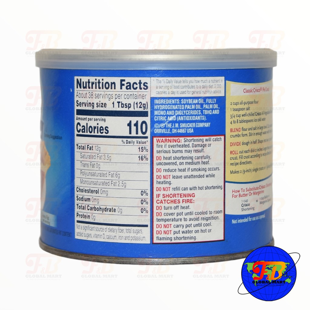 Crisco shortening nutrition label. Crisco Shortening All-Vegetable Allergy and ... - Allergen Inside Nutrition Facts Serving Size 1.00 tablespoon Amount Per Serving Calories 110 Calories from Fat 110 % Daily Value* Total Fat 12g 18.46% Saturated Fat 3g 15% Cholesterol 0g 0% Sodium 0g 0% Total Carbohydrates 0g 0% Protein 0g Vitamin A 0% Vitamin C 0% Calcium 0% Iron 0% Vitamin E 15% *Percentage Daily Values are based on a 2,000 calorie diet. Crisco Shortening Nutrition Information | Healthfully The shortening contains 0 g of carbohydrates. Fat and Protein A single serving of regular or butter flavored Crisco shortening contains 12 g fat 1. This is 18 percent of the recommended daily value of fat for a 2,000-calorie diet. The shortening contains 3 g saturated fat, 6 g polyunsaturated fat and 2.5 g monounsaturated fat. Is Crisco Vegan? A Definitive Guide to Vegetable Shortening Crisco also has less saturated fat levels than butter. On the other hand, compared to its nutritional value, the calorie content in Crisco is very high. This product also doesn't contain carbohydrates, proteins, minerals, or vitamins. Also, similarly to other shortenings, Crisco shortening is 100% fat, unlike margarine and butter that are 80% ... Crisco All-Vegetable Shortening 16 Oz. Pack Of 3. Nutiva Organic Shortening, Original, 15 oz 15 Fl Oz (Pack of 1) (3227) $7.49 ($0.50/Fl Oz) Climate Pledge Friendly + + This item: Crisco All-Vegetable Shortening 16 Oz. Pack Of 3. $14.56 ($0.91/Ounce) Get it as soon as Sunday, Jul 17 FREE Shipping on orders over $25 shipped by Amazon Amazon Brand - Happy Belly Vegetable Oil, 1 gallon (128 Fl Oz)