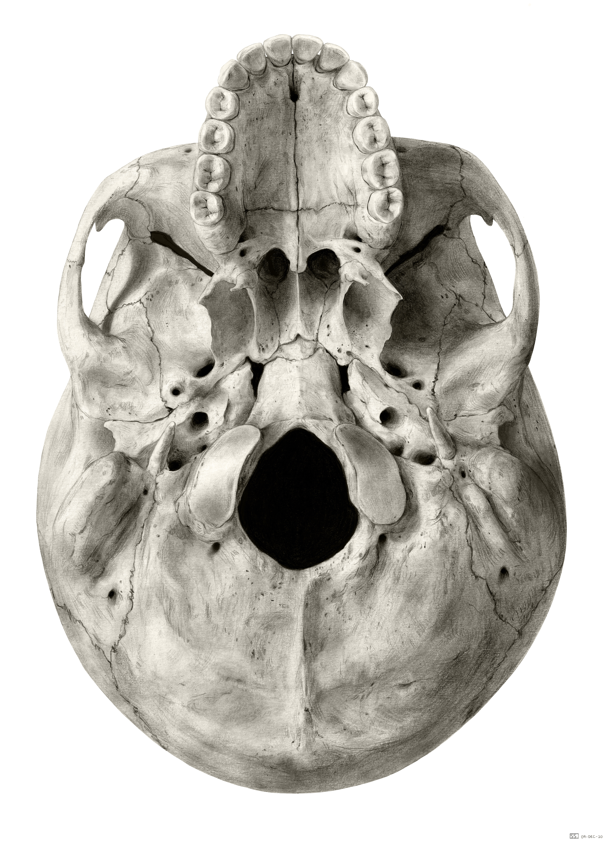 Inferior View of the Skull - Anatomical Justice Inferior View of the Skull. SKU: S04021. This exhibit depicts the anatomy of the inferior skull including: the foramen magnum, occipital condyles, mastoid process, styloid process, mandibular fossa, palatine bone, sphenoid bone, carotid canal, and the jugular fossa. Base Stock Illustration Fee.