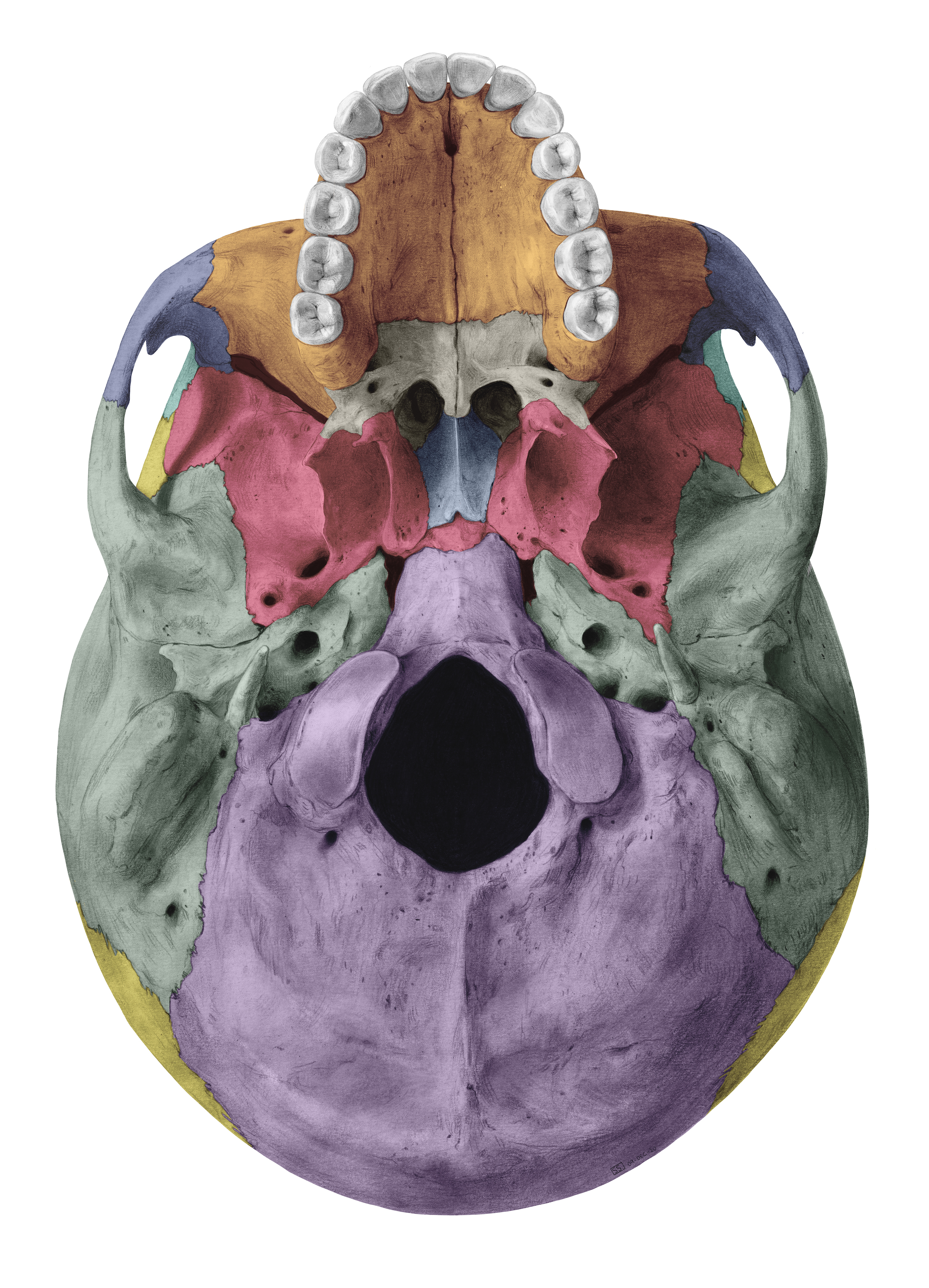PDF Skull Cranial skeleton (Neurocranium) Skull - 11 Skull: lateral view Frankfurt plane (anatomical position, OrbitoMeatal line): upper margin of ext. acoustic meatus - orbit floor → horizontal superior temporal line; inferior temporal line external acoustic meatus; mastoid process level of ant., mid., post. cranial fossae Inferior View of the Skull - Anatomical Justice Inferior View of the Skull. SKU: S04021. This exhibit depicts the anatomy of the inferior skull including: the foramen magnum, occipital condyles, mastoid process, styloid process, mandibular fossa, palatine bone, sphenoid bone, carotid canal, and the jugular fossa. Base Stock Illustration Fee. Inferior view of the base of the skull: Anatomy | Kenhub The parietal bones are difficult to visualise from the inferior view of the skull, however they can be seen articulating with the temporal and occipital bones. They form the posterosuperior part of the skull. Clinical points Young children who present with cleft palate have a failure of the two maxillae to unite in the midline.