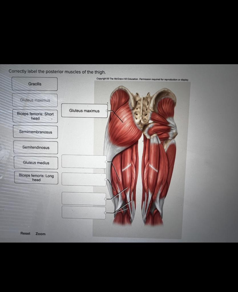 Solved Correctly label the posterior muscles of the thigh - Chegg Anatomy and Physiology questions and answers. Correctly label the posterior muscles of the thigh COOP Gluteus medius Gluteus maximus Adductor magnus Semimembranosus Vastus lateralis Biceps femoris: Short head lliotibial tract Gracilis Semitendinosus Biceps femoris: Long head.