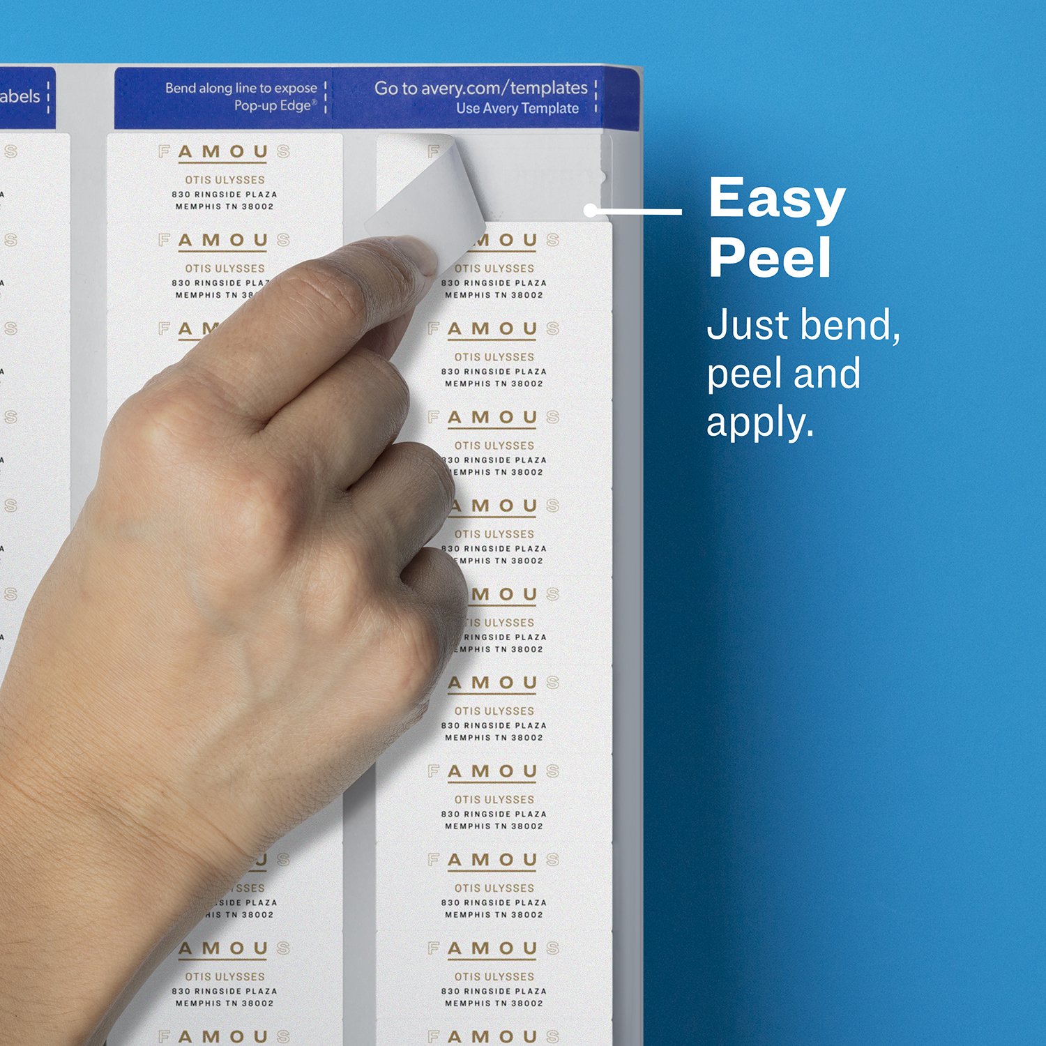 Avery® Easy Peel Mailing Laser Labels - Mac Papers Inc The patented Easy Peel feature makes applying these labels a breeze. Simply bend the label sheet to expose the Pop-up Edge, peel off your label and fold the sheet back to flat. To easily customize your labels, use Avery's free online templates and designs. Each sheet includes 60 labels that each measure 1-3/4" wide x 2/3" high.