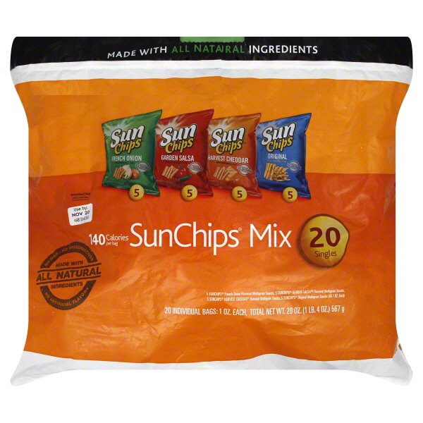 LAY 49932 Frito-Lay Sun Chips Variety Pack - Mixed - 30 / Bo Marketing Information: With 30 percent less fat than regular potato chips, this Sun Chips variety pack delivers heart-healthy snacks with flavorful waves of whole grain goodness. All-natural ingredients do not contain any artificial flavors or preservatives for a rich, wholesome taste. Single-serve bags ensure maximum freshness and flavor.