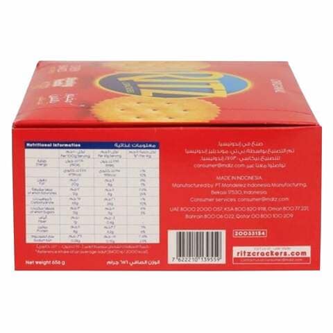 Calories in Ritz Hint of Salt Crackers and Nutrition Facts - FatSecret Nutrition Facts Serving Size 5 crackers (16 g) Amount Per Serving Calories 80 % Daily Values* Total Fat 4.00g 5% Saturated Fat 1.000g 5% Trans Fat 0.000g Polyunsaturated Fat 2.000g Monounsaturated Fat 1.000g Cholesterol 0mg 0% Sodium 25mg 1% Total Carbohydrate 10.00g 4% Dietary Fiber 0.0g 0% Sugars 1.00g Includes 1.00g Added Sugars 2% Protein 1.00g