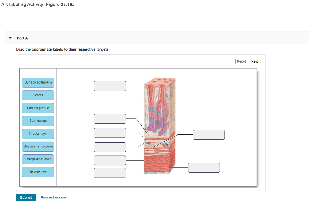 Ch 23 HW.pdf - 10/17/2018 Ch 23 | Course Hero ANSWER: Correct Artlabeling Activity: Figure 23.16b Part A Drag the appropriate labels to their respective targets. ANSWER: HelpReset Surface epithelium Oblique layerLamina propria Muscularis mucosae Submucosa Circular layer Longitudinal layer Serosa Please refer to the image given below thank you.