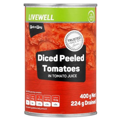 Chopped Tomatoes 400g Can - Nutrition Facts - MyNetDiary There are 21 calories in serving of Chopped Tomatoes 400g Can by Freshona from: Carbs 4g, Fat 0.2g, Protein 1g. Get full nutrition facts for your favorite ... How many calories in Chopped Tomatoes 400g - Fitatu Nutritional values in Chopped Tomatoes 400g per 100 g: ; Proteins 1.00. Animal 0. Plant ; Fats 0.50. Saturated 0. Monounsaturated ; Carbohydrates 3.00. Net carbs ...