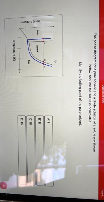 Solved Label the phase diagram of pure solvent and a - Chegg Question: Label the phase diagram of pure solvent and a solution Freezing point of solution GAS Solution Pure solvent 1 atm Boiling pointFreezing point of of solvent solvent ??? 11 SOLID AT AP Boiling pointLIQUID of solution Temperature Show transcribed image text Expert Answer 100% (11 ratings) Transcribed image text: